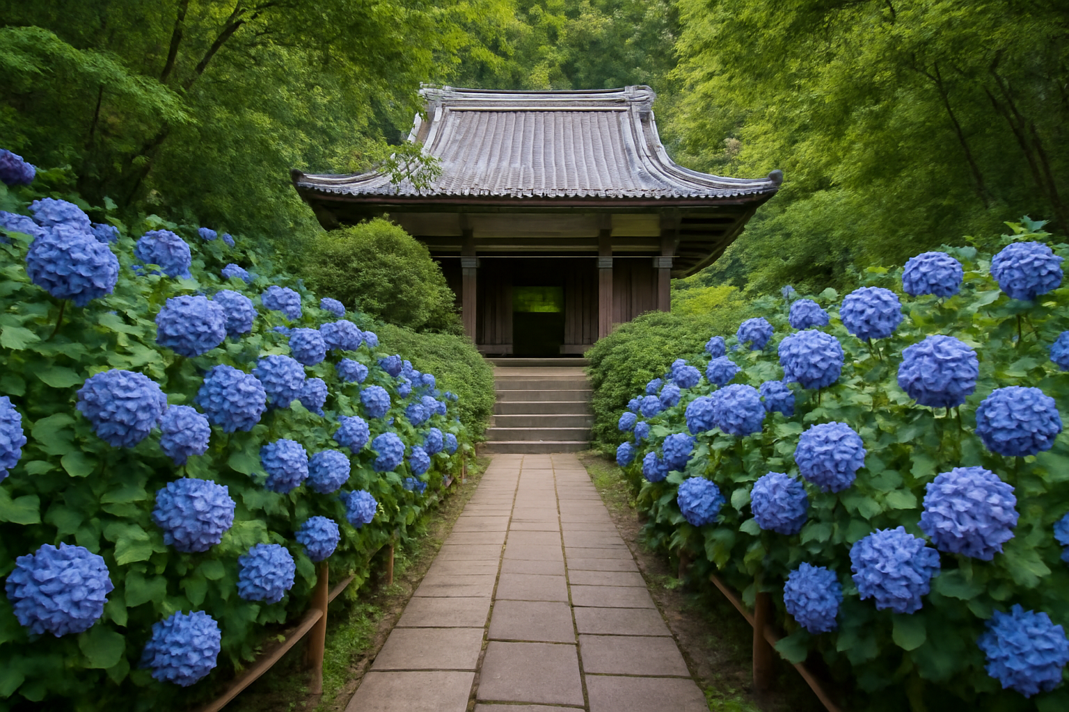 明月院の紫陽花は、境内全体に広がり、緑と青紫色のアジサイが美しく調和しています。ここでは、静かで落ち着いた雰囲気の中で紫陽花を見ることができ、まるで絵画のような美しい景色を堪能できます。