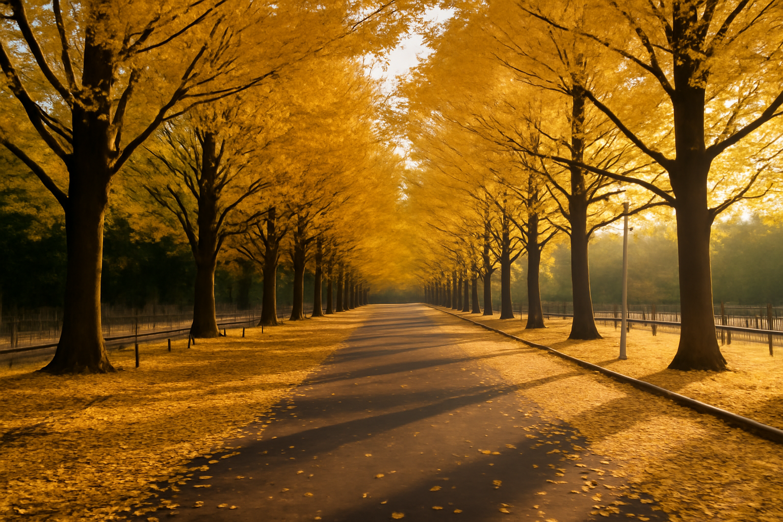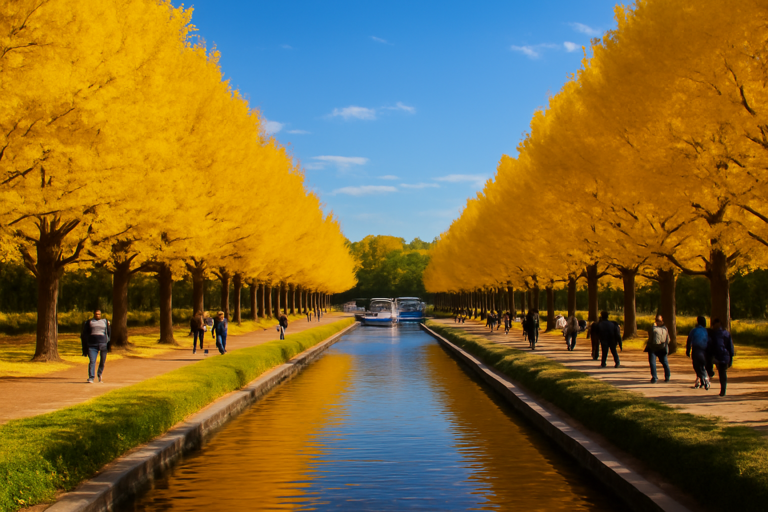 一番の見どころは「カナール」と呼ばれる整然と並ぶイチョウ並木。黄色に染まったトンネルのような並木道を歩いていると、まるで海外の庭園に迷い込んだかのような感覚になります。朝の光で輝くイチョウも素敵ですが、夕暮れ時の柔らかなオレンジ光の中で見る風景もまた格別です。